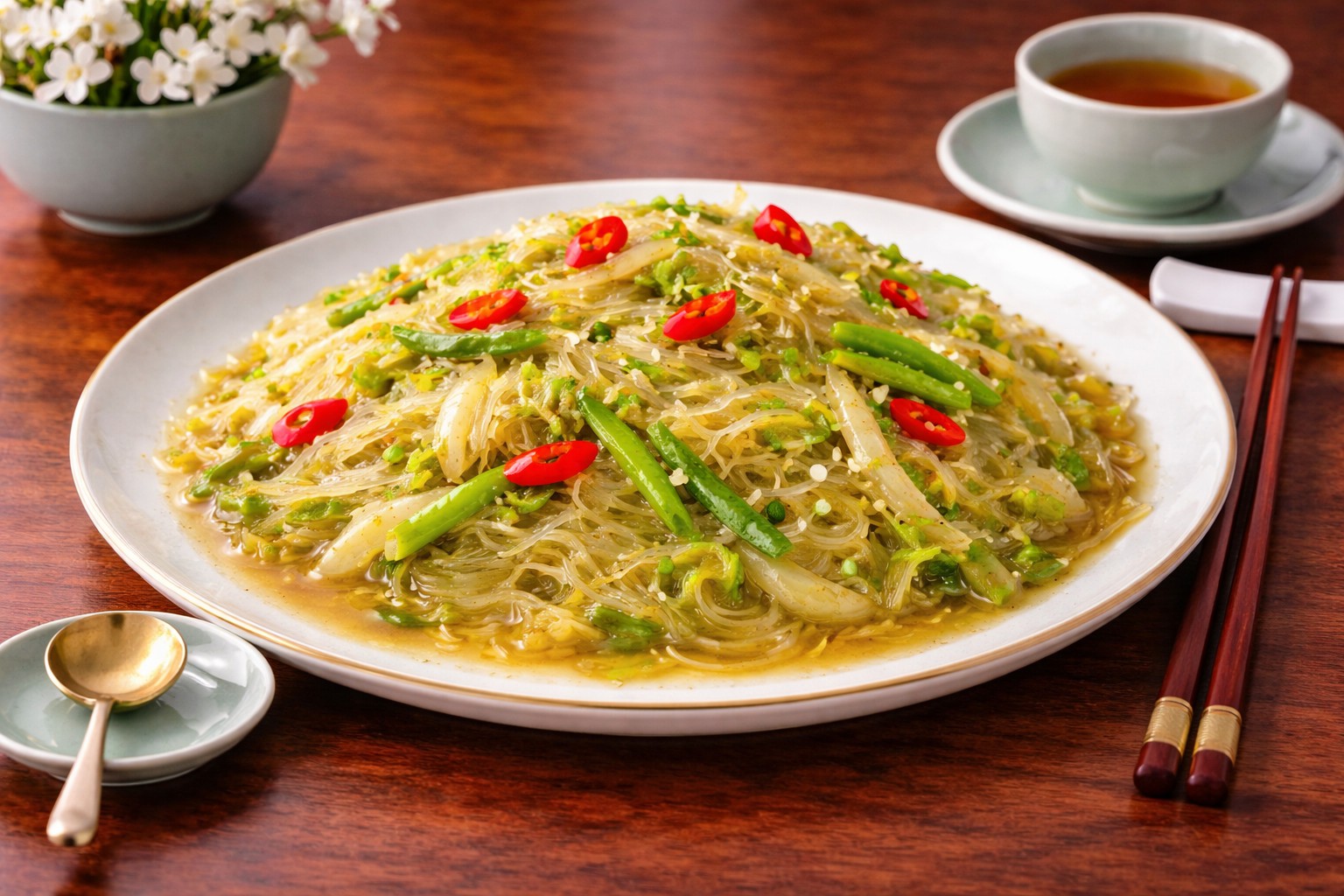 Stir-Fried Vermicelli with Pickled Vegetables is a flavorful and appetizing vegetarian dish that combines the tangy taste of pickled vegetables with the soft and chewy texture of vermicelli. The vermicelli absorbs the seasoning beautifully, becoming tender and slightly glossy, while the pickled vegetables add a refreshing sourness that enhances the overall flavor. The contrast between the soft noodles and crisp vegetables creates a satisfying texture.
