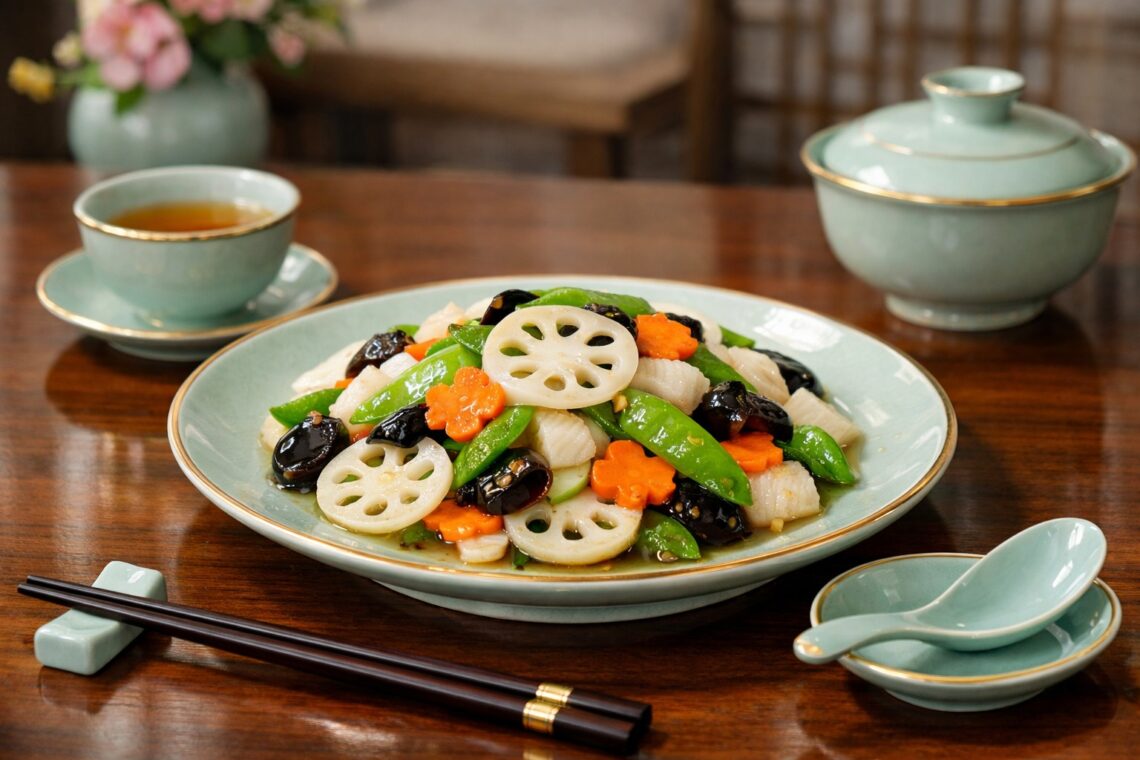 每週一素:荷塘小炒 2026年2月 第1周 簡介:荷塘小炒是一道色彩清雅、層次分明的經典素食清炒菜,以蓮藕的清脆爽口為核心,搭配胡蘿蔔、荷蘭豆、黑木耳等多種蔬菜,呈現出宛如荷塘般清新自然的視覺與口感體驗。蓮藕切片後在快火...